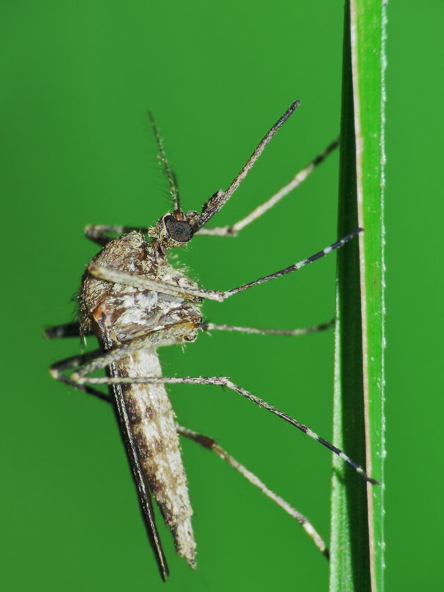 Комментарий. Самка кровососущего комара из семейства Culicidae, сидящая на листе осоки у берега Лебедянского пруда.