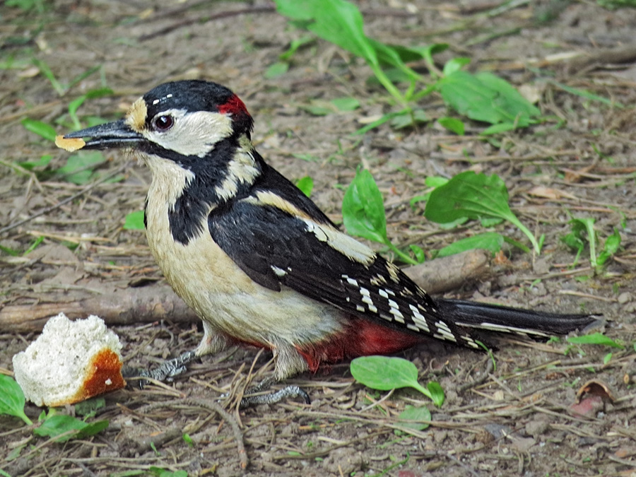 В те ненастные дни, не раз я замечал на кормушках большого пёстрого дятла (Dendrocopos major): схватив увесистую горбушку