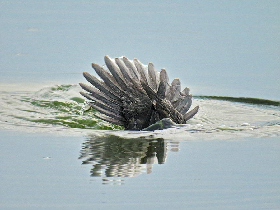 ныряльщица вдруг стремительно переворачивалась головою вниз и под наклоном уходила в глубину, растопырив веером хвост,