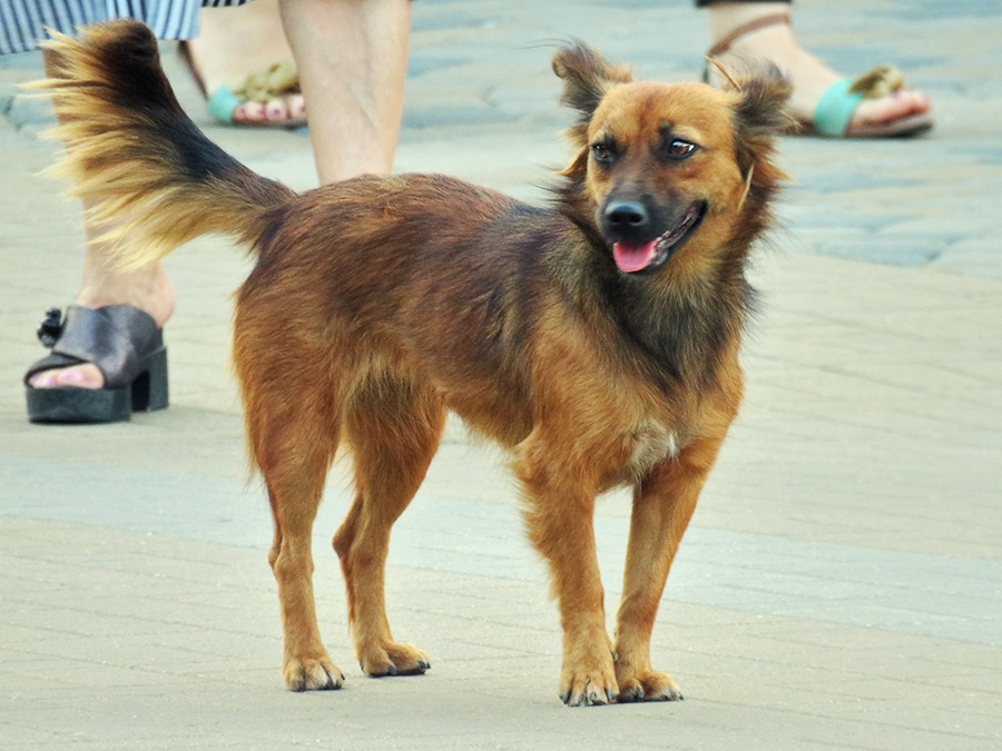 Комментарий. Маленький, рыжий и, видимо, "ничейный" пёсик чувствует себя совершенно непринуждённо на городской площади среди множества людей. Здесь всегда чем-нибудь накормят, а то и погладят.
