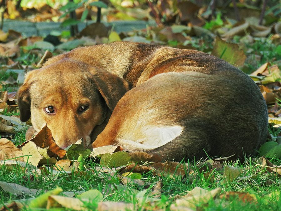 Комментарий. Собака, мирно дремавшая на газоне среди разноцветных осенних листьев.