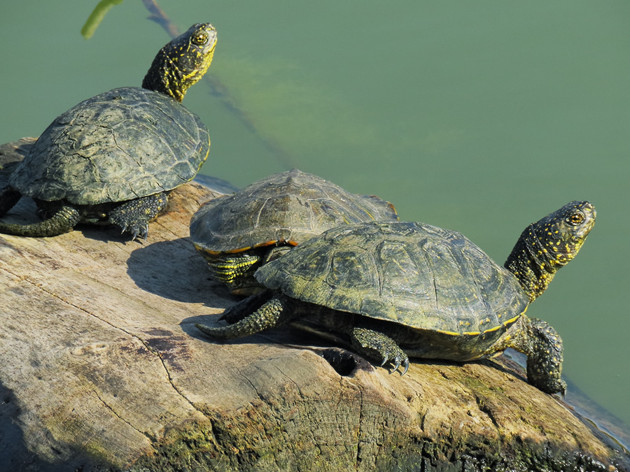 Наглядный пример "добрососедских" отношений европейской болотной и красноухой черепах, обитающих в озере Карасун.
