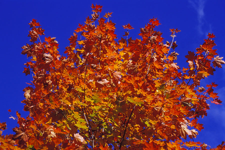 Комментарий. Игра ярких красок, на которые так щедра бывает наша осень. Снимок сделан телеобъективом "снизу вверх", что позволило подчеркнуть густую, сочную синеву небес. А клёны... это для меня загадка. Часто, особенно в городе, они совсем невыразительны осенью - листья просто буреют и засыхают прямо на дереве. Но иногда, ни с того ни с сего, вдруг как огнём полыхнёт!
