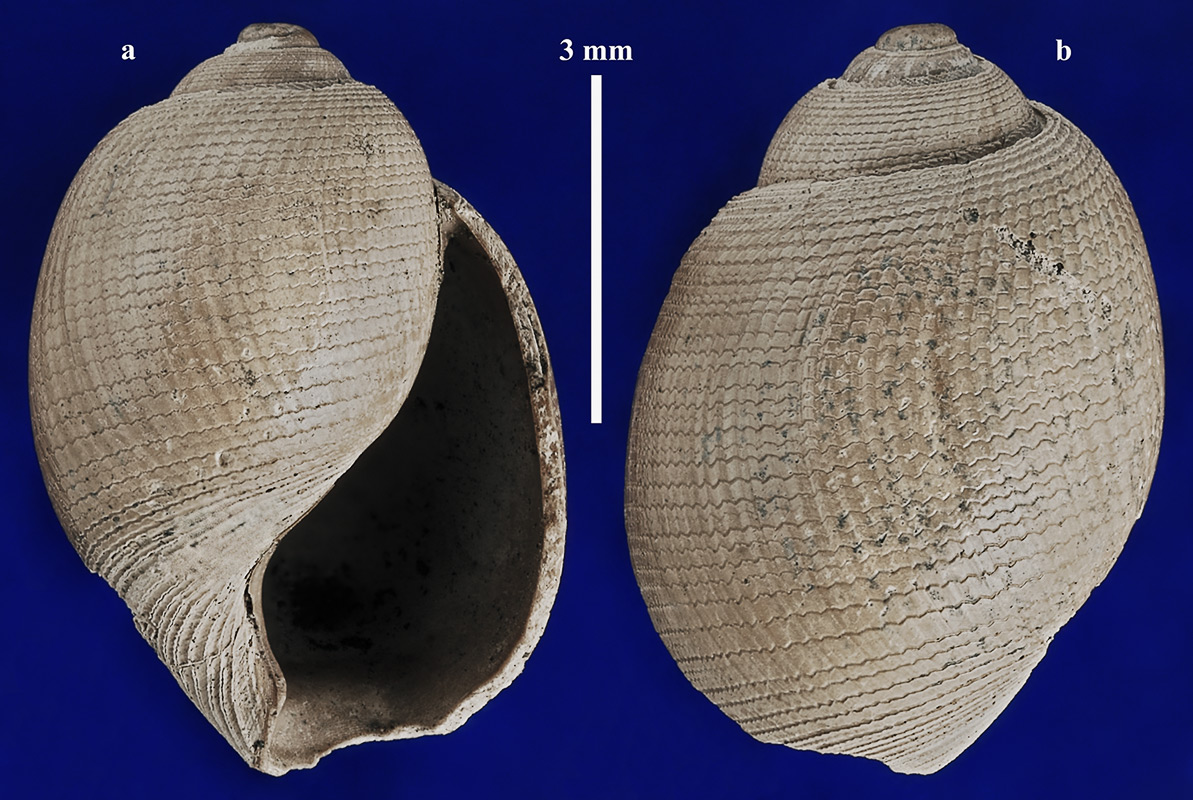 Комментарий. Раковина с сохранившимся протоконхом и частично сохранившимся устьем. a - вид со стороны устья; b - вид со стороны, противоположной устью.