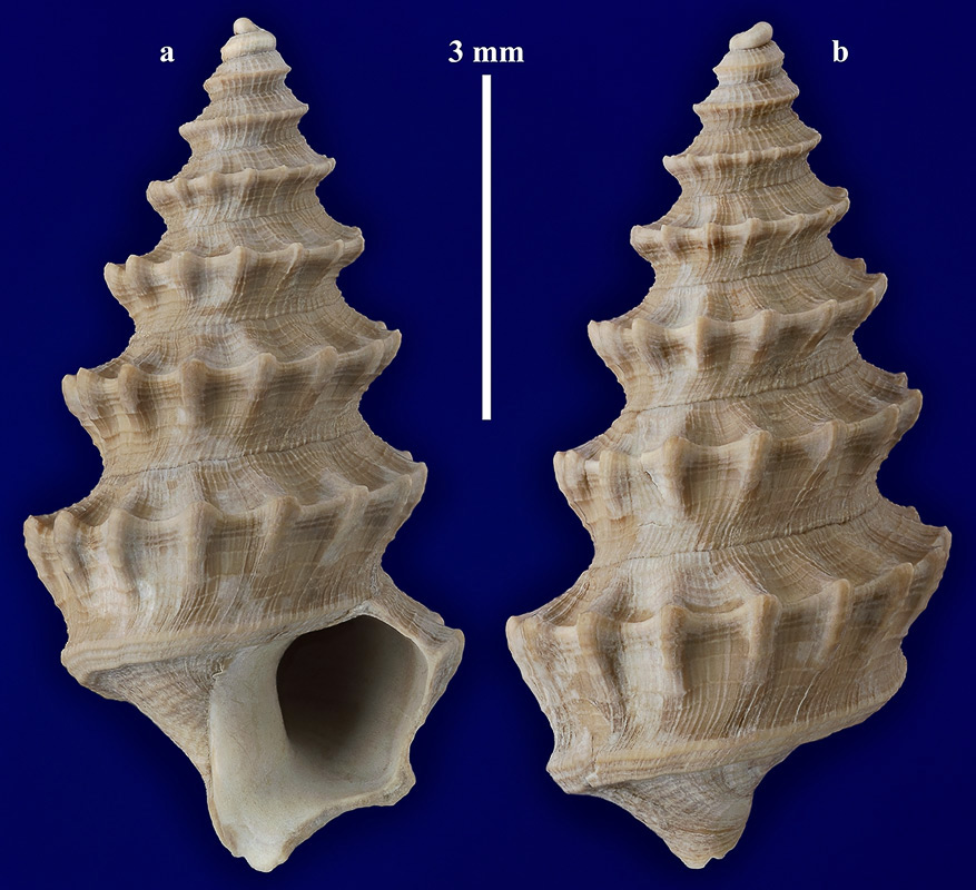 Комментарий. Раковина с сохранившимся протоконхом и частично сохранившимся устьем. a - вид со стороны устья; b - вид со стороны, противоположной устью.