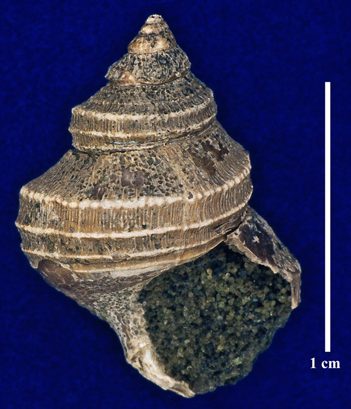 Комментарий. Раковина с частично сохранившимся поверхностным слоем. Вид со стороны устья.