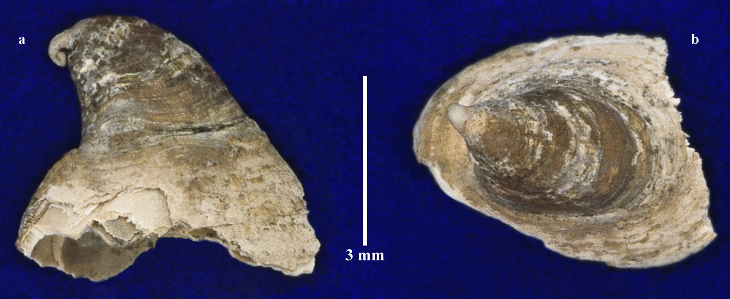Комментарий. Частично сохранившаяся раковина с сохранившимся протоконхом. a - вид сбоку; b - вид сверху.