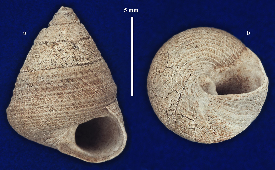 Раковина геронтической ? особи с сохранившимся устьем. a - вид со стороны устья; b - вид снизу.