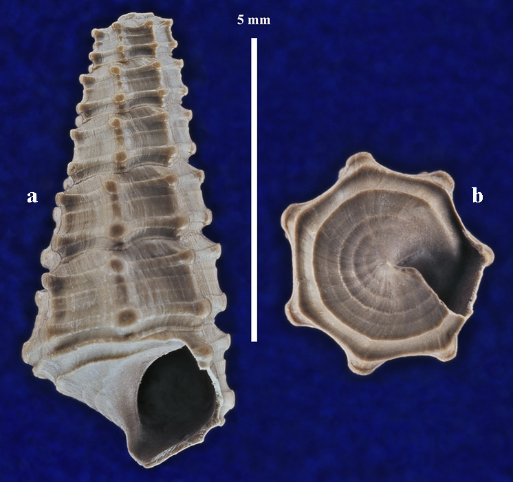 Комментарий. Частично сохранившаяся раковина аберрантной особи. Раковина имеет семигранную форму, что нетипично для данного вида.       a - вид со стороны устья;       b - вид снизу.