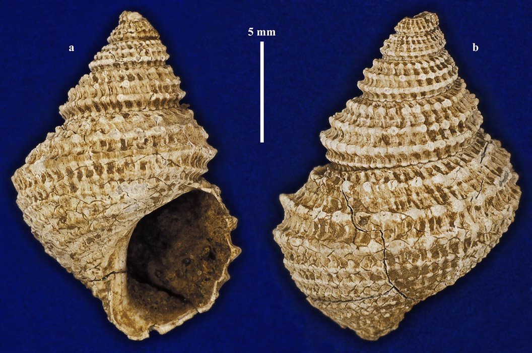 Комментарий. Раковина с частично сохранившимся устьем. a - вид со стороны устья; b - вид со стороны, противоположной устью.
