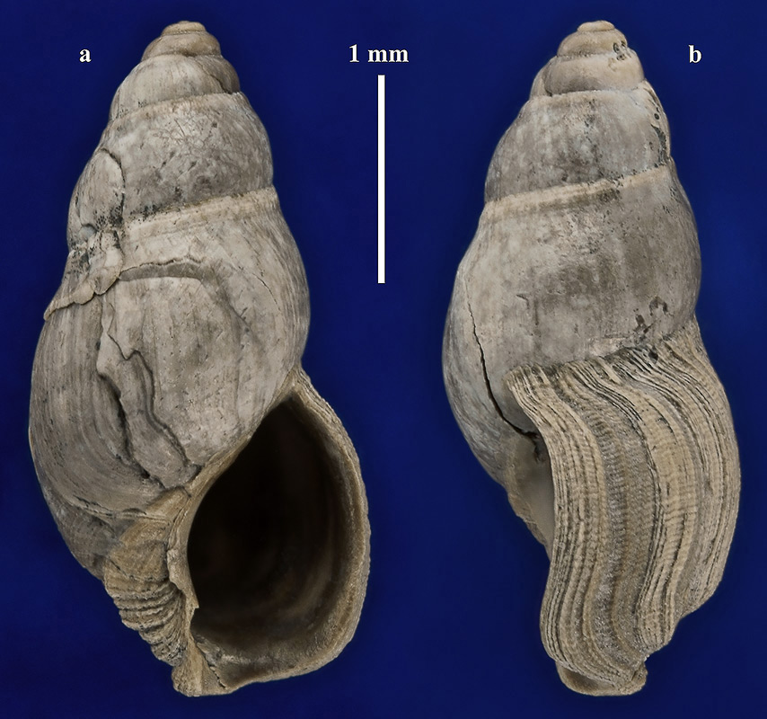 Комментарий. Раковина взрослой особи с сохранившимися протоконхом и устьем. a - вид со стороны устья; b - вид сбоку от устья.