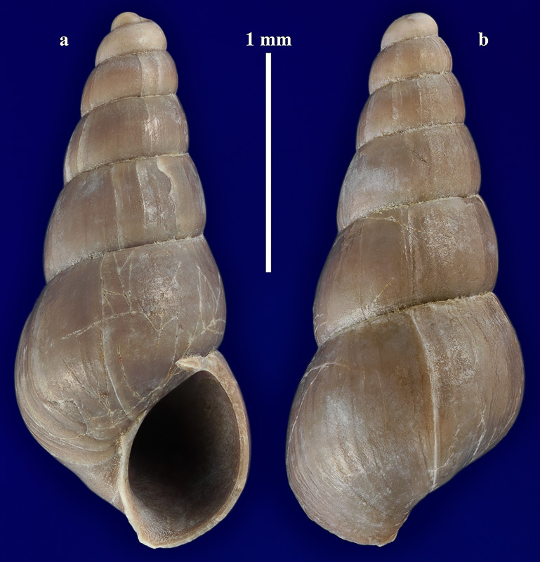 Комментарий. Раковина молодой особи с сохранившимся протоконхом и частично сохранившимся устьем. a - вид со стороны устья; b - вид со стороны, противоположной устью.