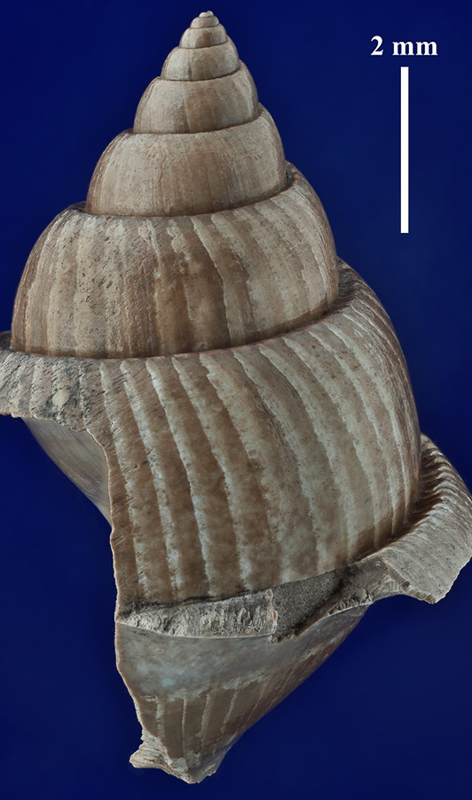 Комментарий. Частично сохранившаяся раковина. Видны "тени" прижизненной окраски. Вид сбоку.