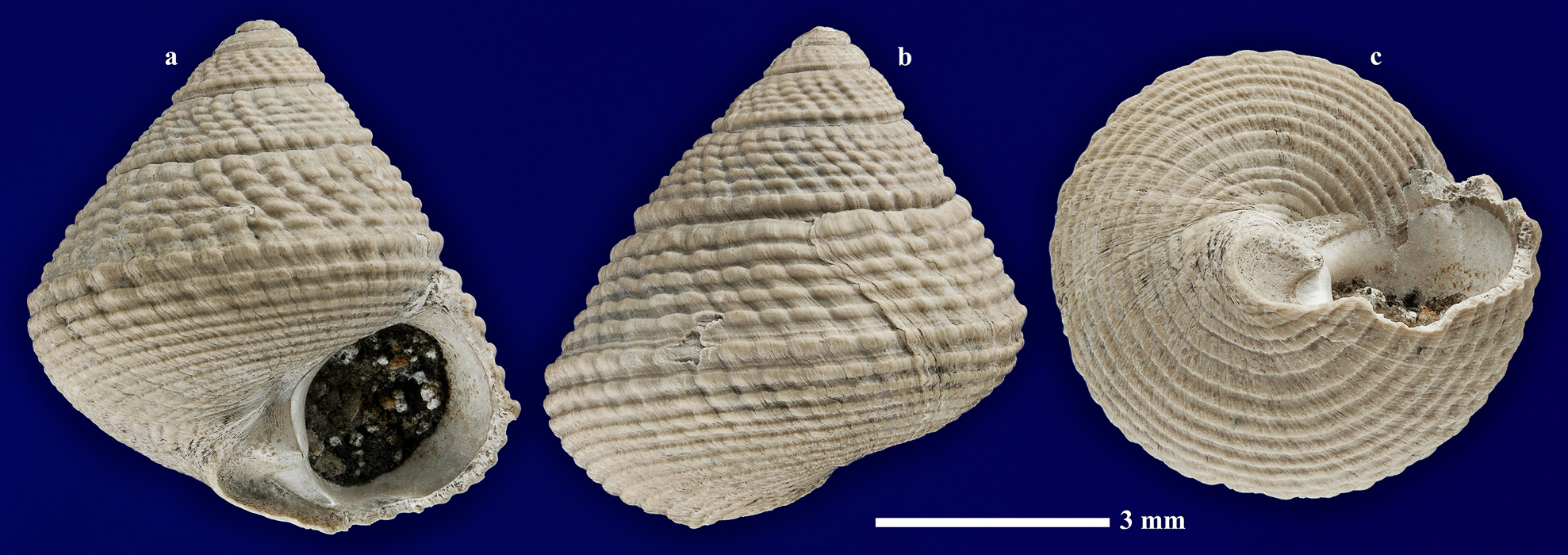 Раковина взрослой особи с сохранившимся протоконхом и частично сохранившимся устьем.