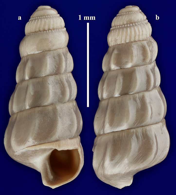 Комментарий. Раковина молодой особи с сохранившимся протоконхом. a - вид со стороны устья; b - вид со стороны, противоположной устью.