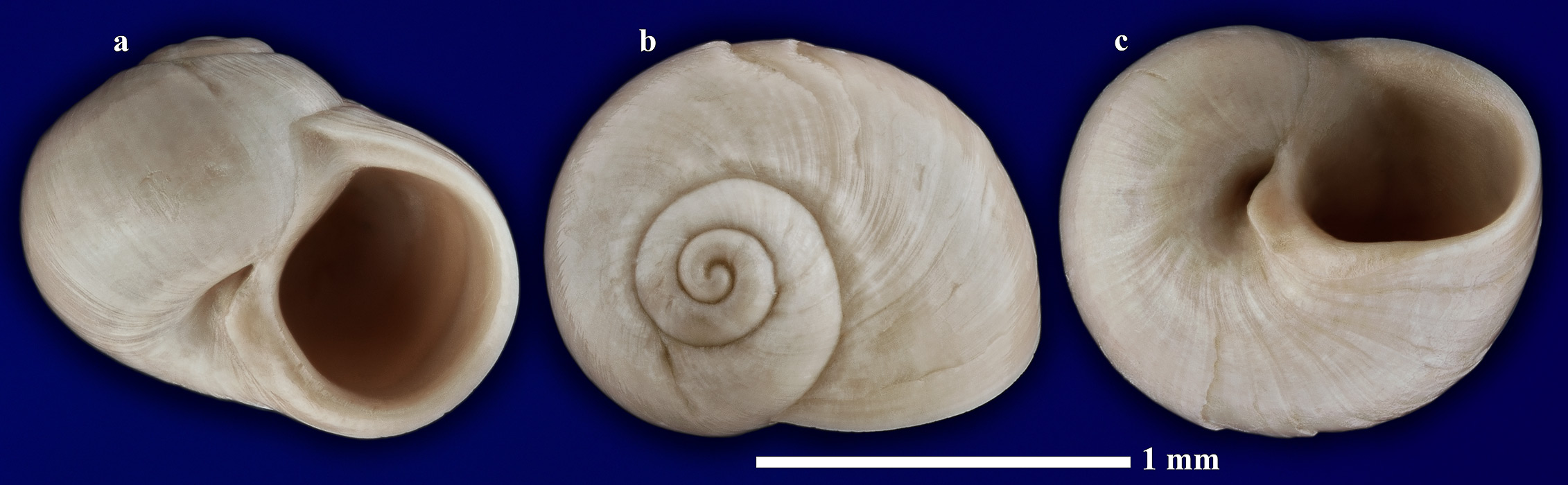 Комментарий. Полностью сохранившаяся раковина взрослой особи. a - вид со стороны устья; b - вид сверху; c - вид снизу.