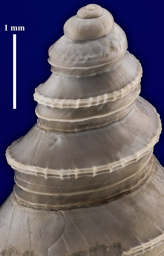 Начальные обороты частично сохранившейся раковины взрослой особи с сохранившимся протоконхом.