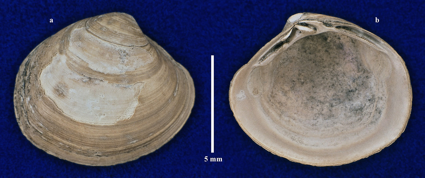 Правая створка раковины крупной взрослой особи. a - вид с наружной стороны; b - вид с внутренней стороны.