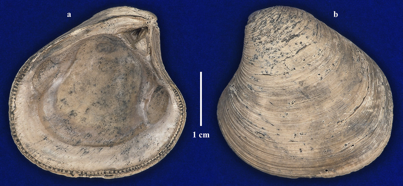 Левая створка раковины. a - вид с внутренней стороны; b - вид с наружной стороны.