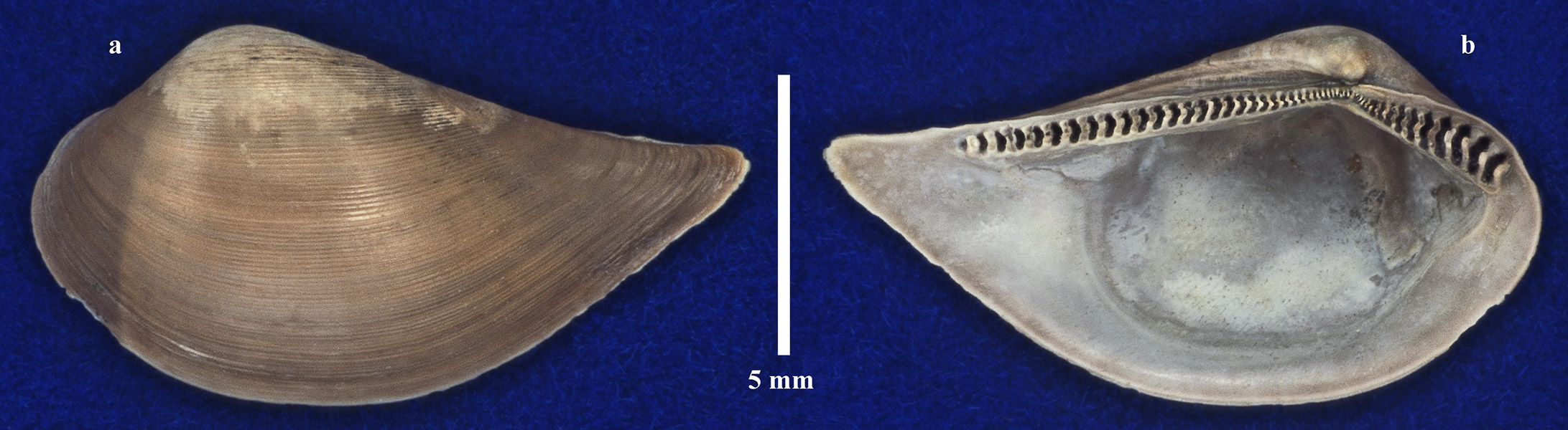 Левая створка раковины. a - вид с наружной стороны; b - вид с внутренней стороны.