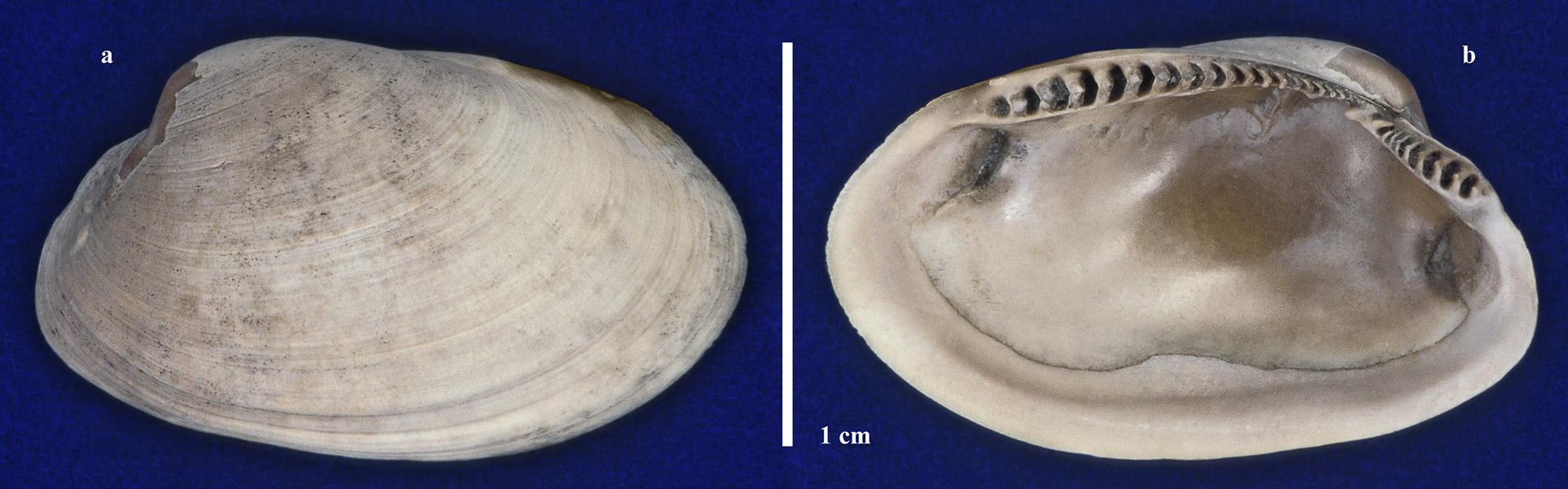 Правая створка раковины. a - вид с наружной стороны; b - вид с внутренней стороны.