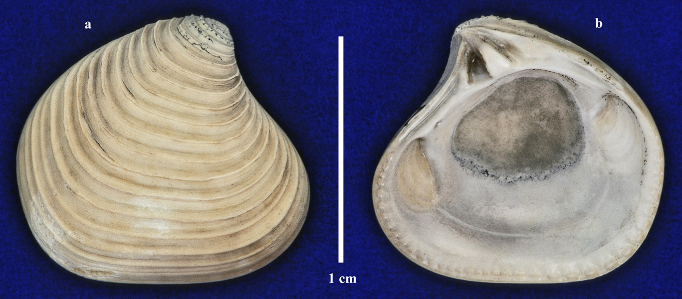 Правая створка раковины. a - вид с наружной стороны; b - вид с внутренней стороны.