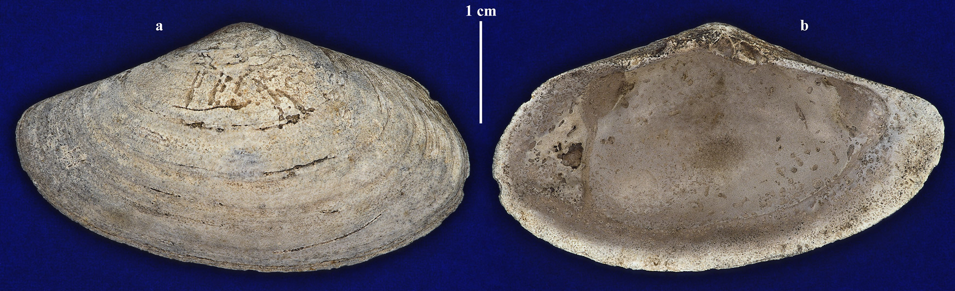 Левая створка раковины. a - вид с наружной стороны; b - вид с внутренней стороны.
