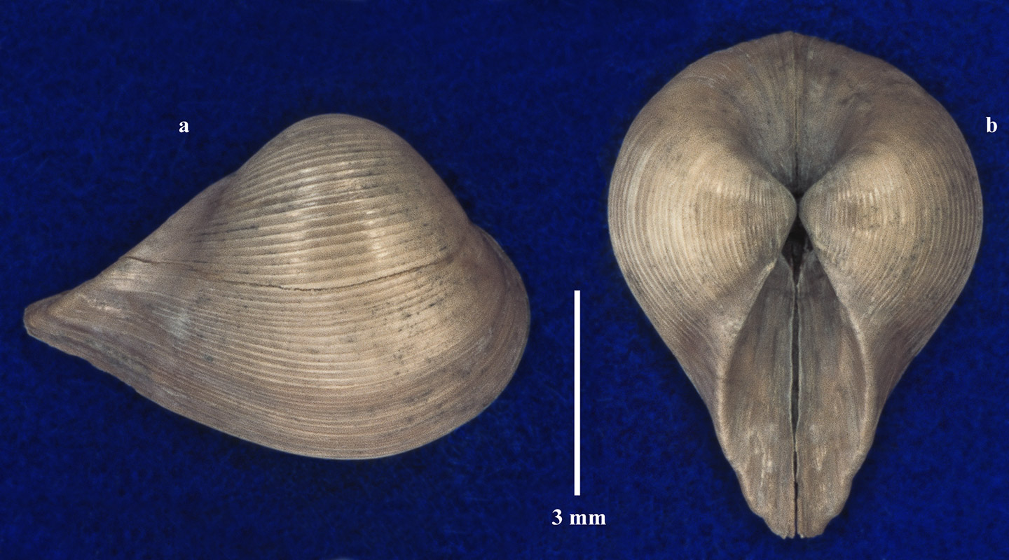 Раковина. a - вид со стороны правой створки; b - вид сверху.
