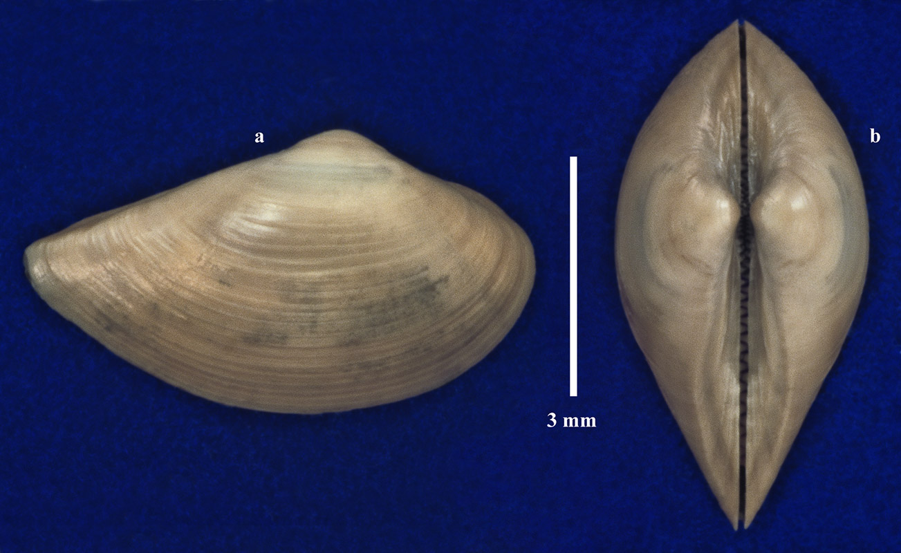 Раковина. a - вид правой створки с наружной стороны; b - вид сверху.