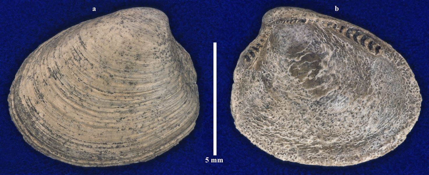 Левая створка раковины. a - вид с наружной стороны; b - вид с внутренней стороны.