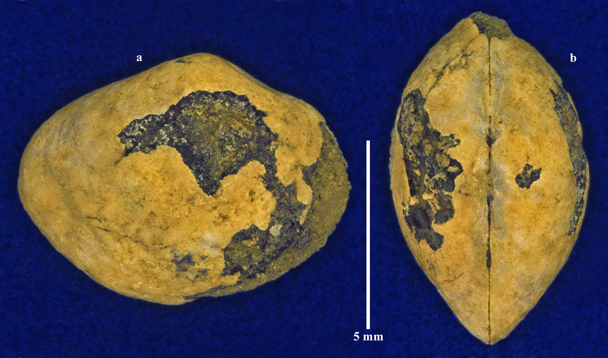 Частично сохранившаяся раковина, замещённая кальцитом. a - вид со стороны правой створки; b - вид сверху.