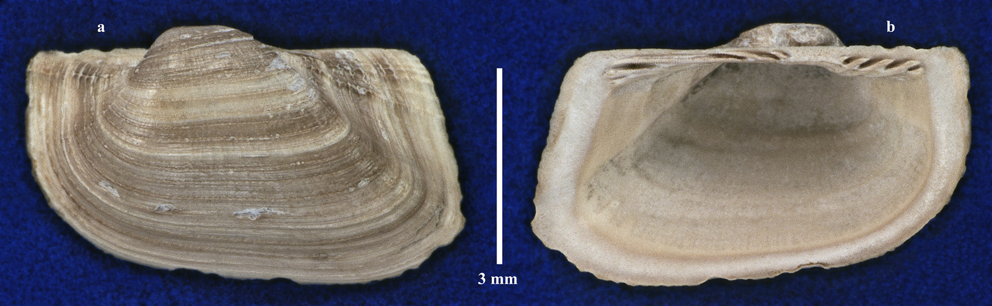 Комментарий. Левая створка раковины молодой особи. a - вид с наружной стороны; b - вид с внутренней стороны.