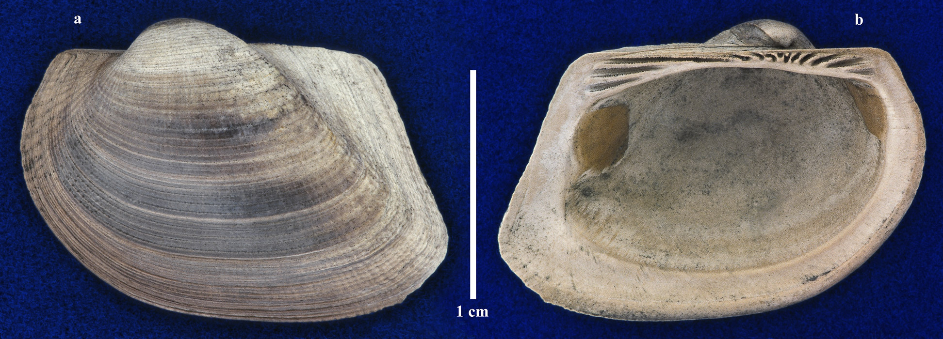 Левая створка раковины. a - вид с наружной стороны; b - вид с внутренней стороны.