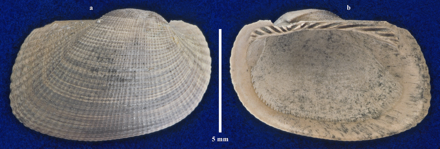 Правая створка раковины. a - вид с наружной стороны; b - вид с внутренней стороны.