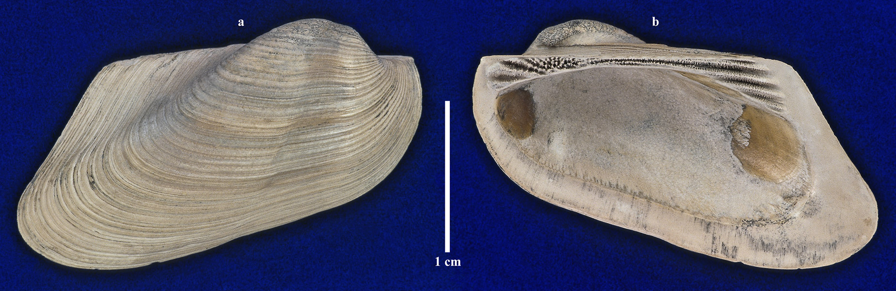 Правая створка раковины. a - вид с наружной стороны; b - вид с внутренней стороны.