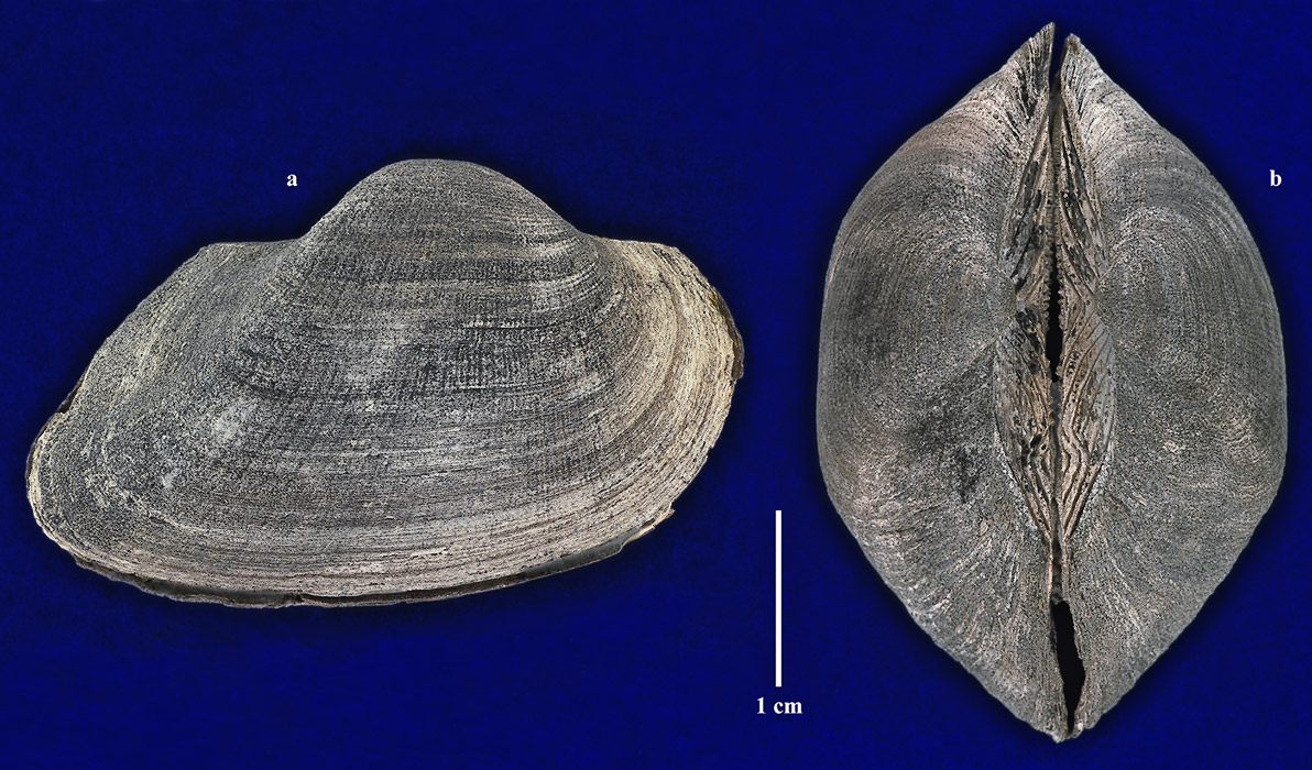 Раковина. a - вид со стороны правой створки; b - вид сверху.