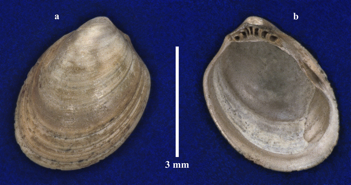 Правая створка раковины крупной особи. a - вид с наружной стороны; b - вид с внутренней стороны.