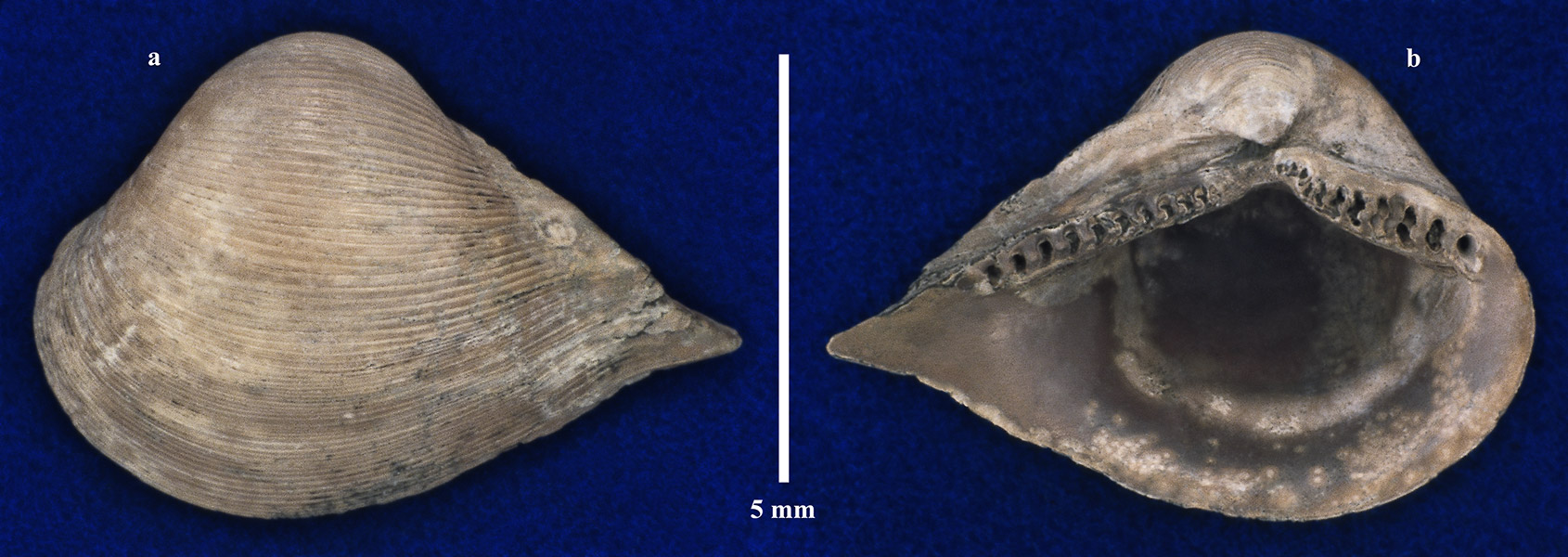 Левая створка раковины. a - вид с наружной стороны; b - вид с внутренней стороны.