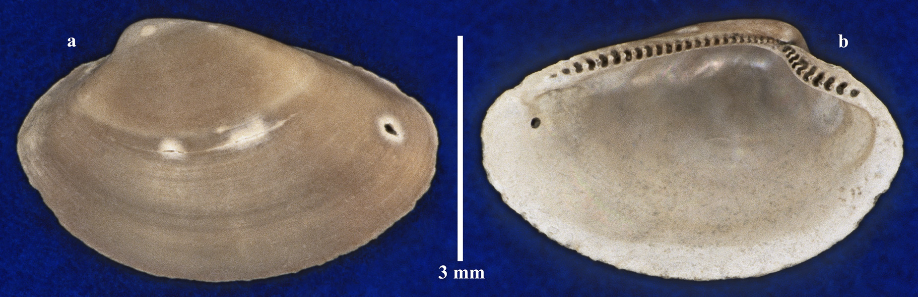 Левая створка раковины ювенильной особи. a - вид с наружной стороны; b - вид с внутренней стороны.