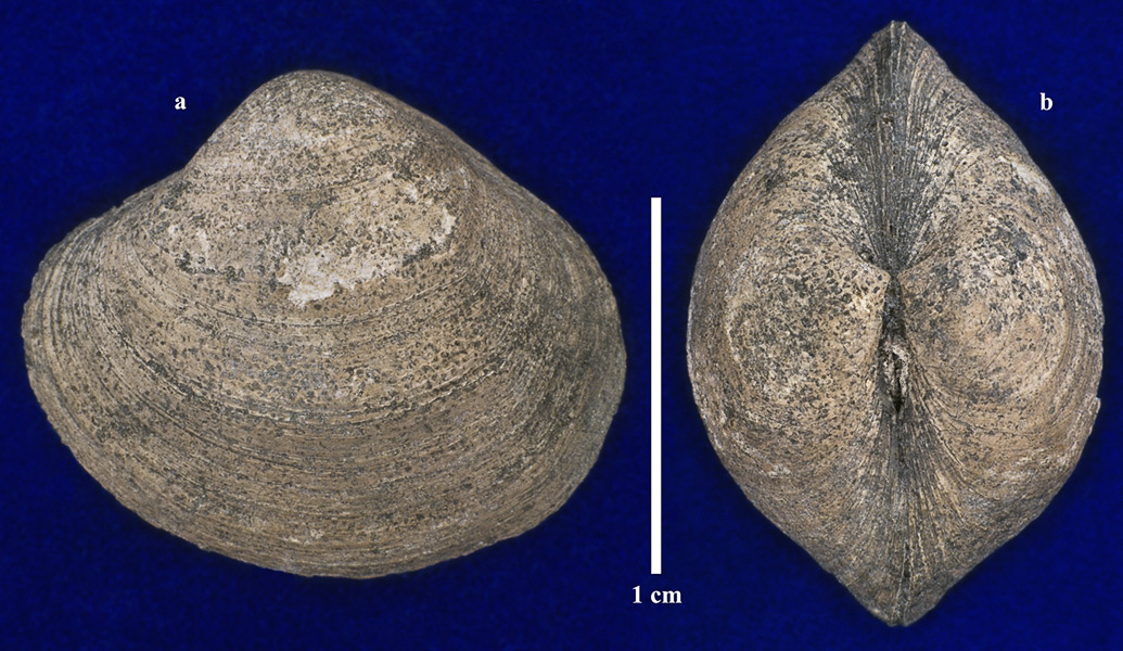 Раковина взрослой особи. a - вид со стороны левой створки; b - вид сверху.