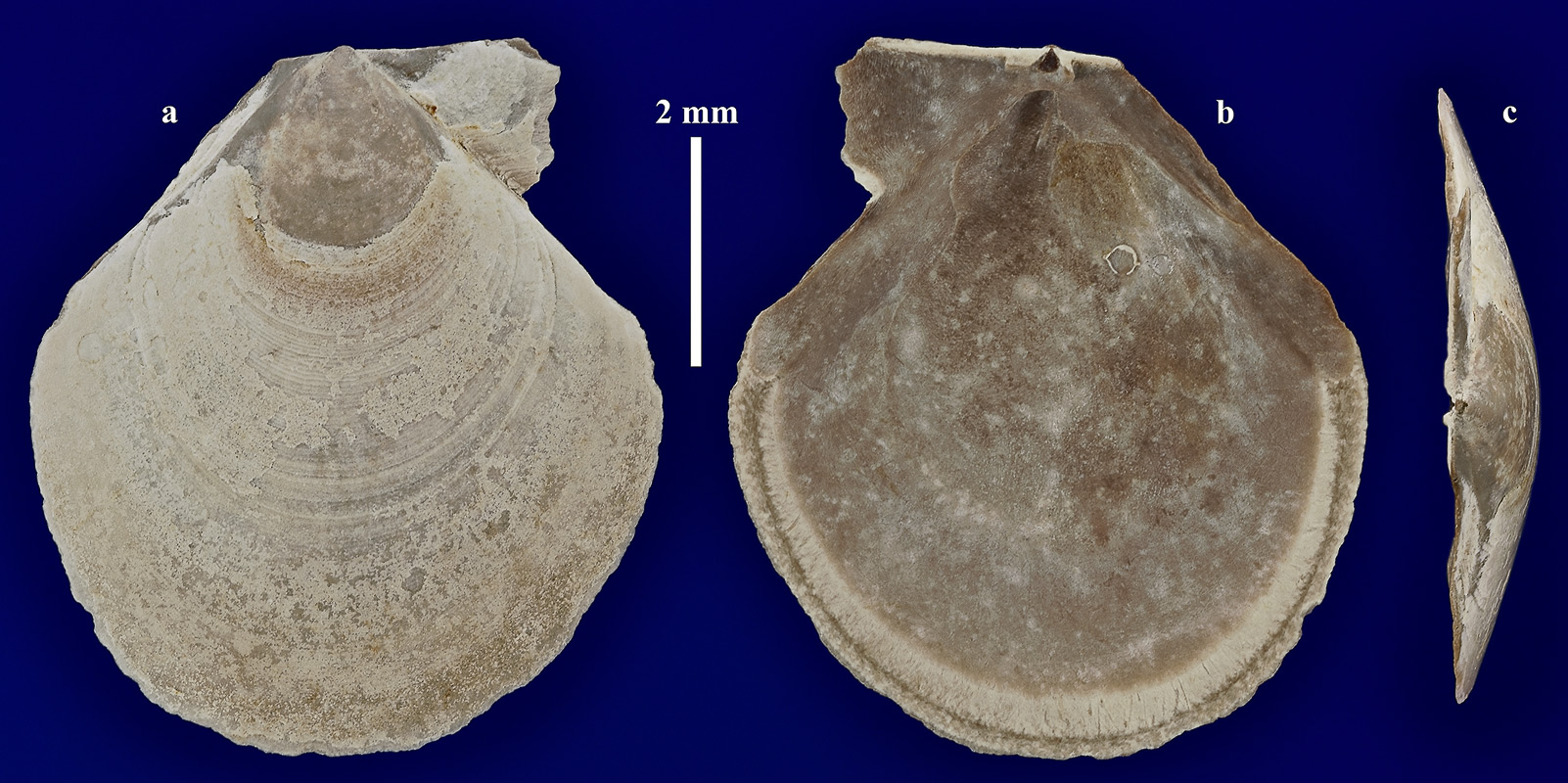 Комментарий. Правая створка раковины. a - вид с наружной стороны; b - вид с внутренней стороны; c - вид сверху.