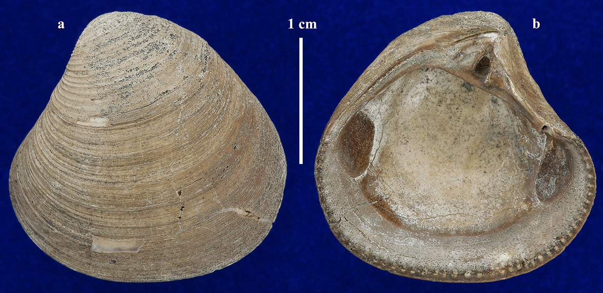 Левая створка раковины. a - вид с наружной стороны; b - вид с внутренней стороны.