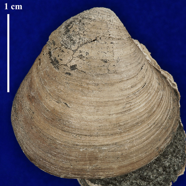 Правая створка раковины на вмещающей породе. Вид с наружной стороны.