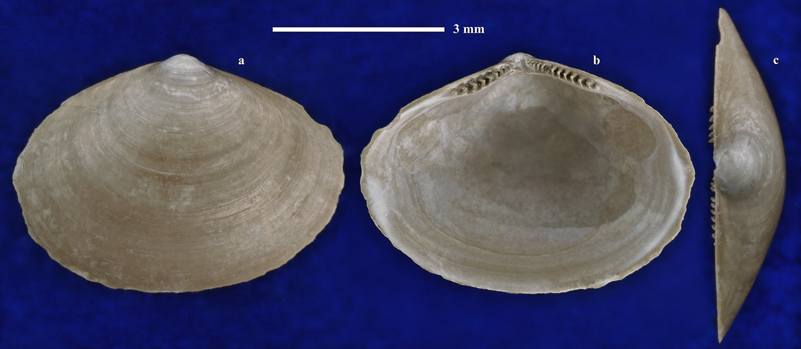 Правая створка раковины крупной взрослой особи. a - вид с наружной стороны; b - вид с внутренней стороны; c - вид сверху.