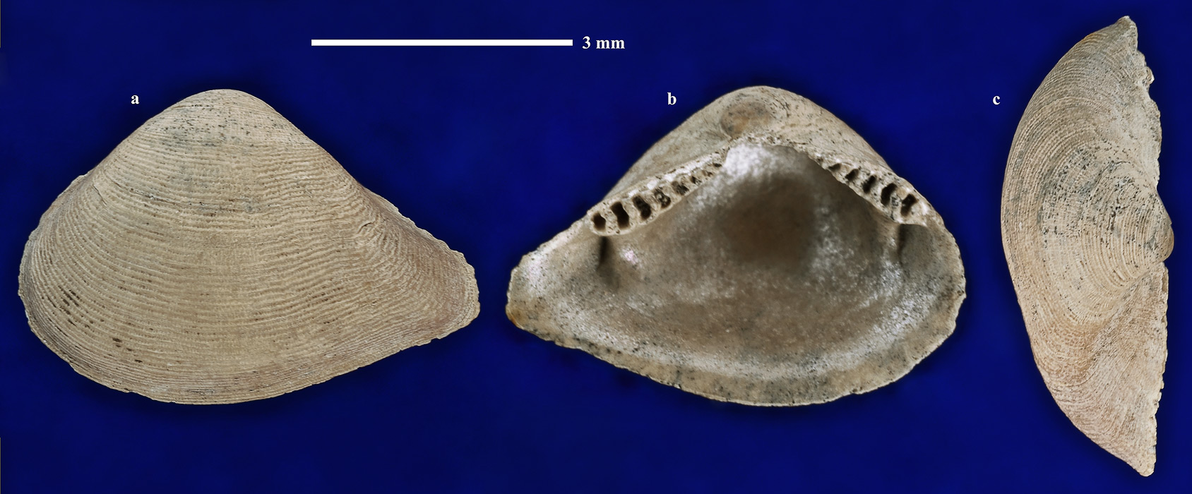 Комментарий. Левая створка раковины взрослой особи. a - вид с наружной стороны; b - вид с внутренней стороны; c - вид сверху.