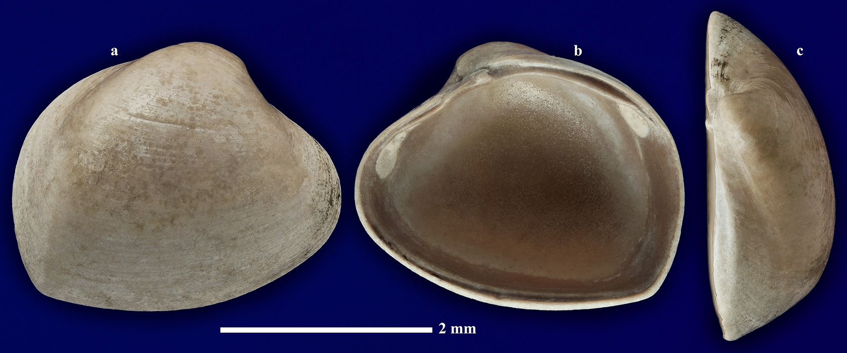 Правая створка раковины. a - вид с наружной стороны; b - вид с внутренней стороны; c - вид сверху.