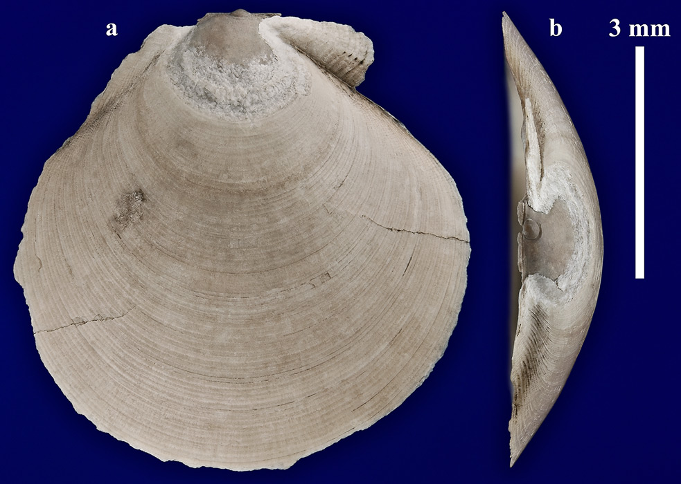 Правая створка раковины взрослой особи. a - вид с наружной стороны; b - вид сверху.