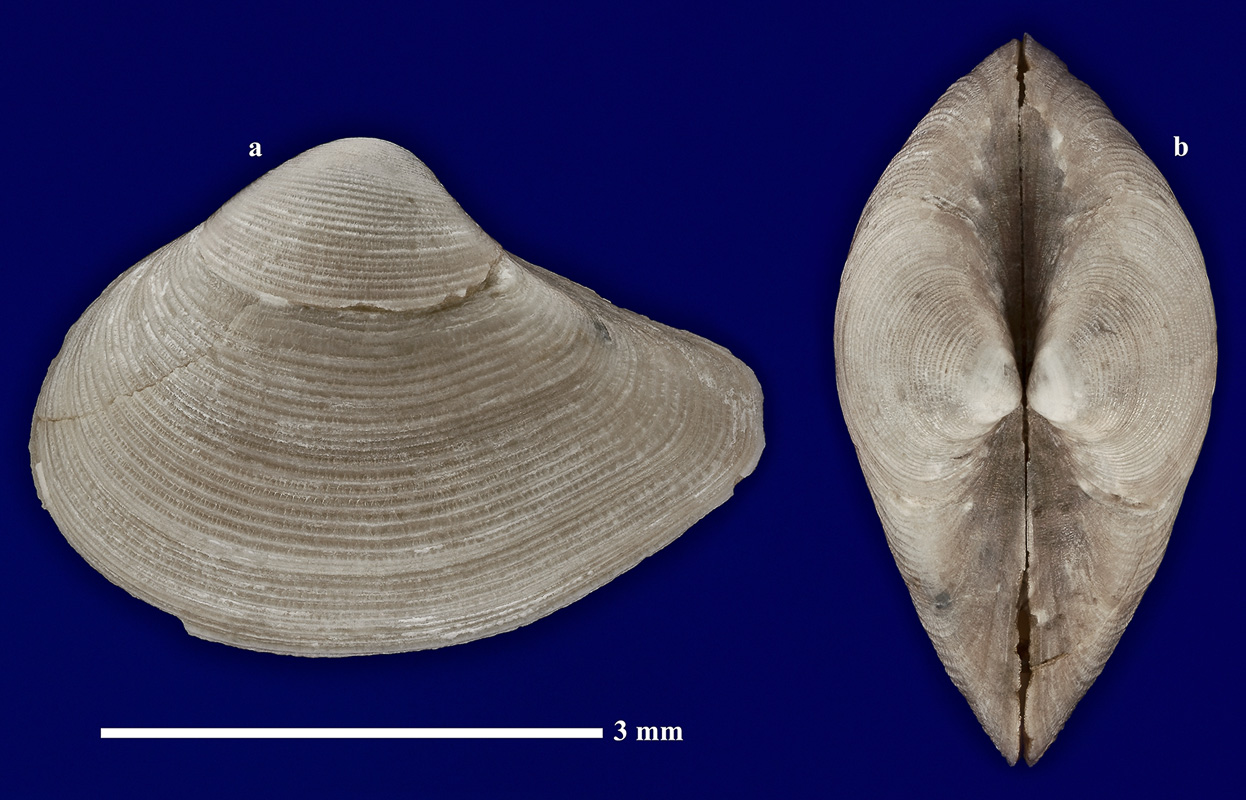 Раковина взрослой особи. a - вид со стороны левой створки; b - вид сверху.
