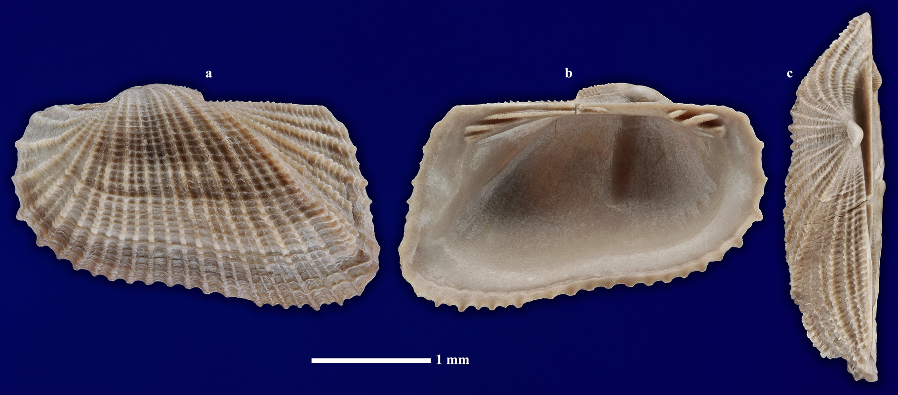 Левая створка раковины взрослой (?) особи. a - вид с наружной стороны; b - вид с внутренней стороны; c - вид сверху.