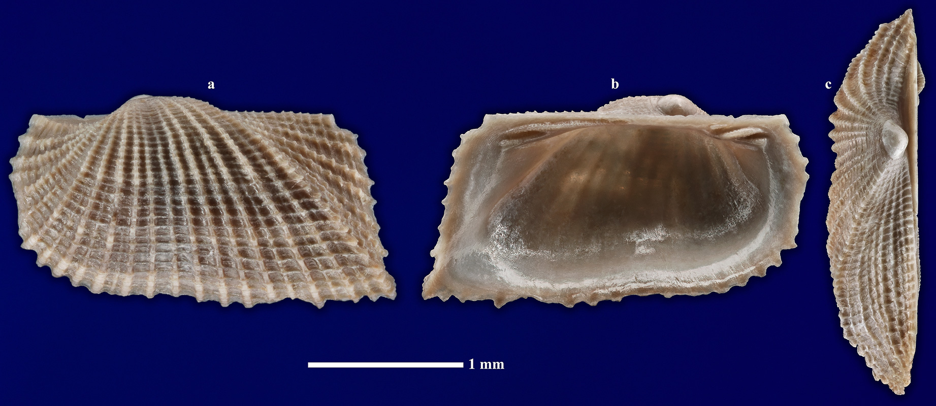 Размеры. Длина створки около 2,5 мм; высота - около 1,38 мм; толщина створки - около 0,59 мм. Длина масштабного отрезка равна 1 мм.